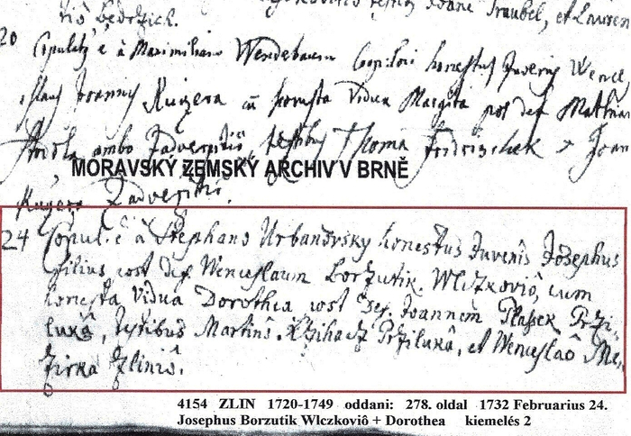 „Copulatea Stephanus Urbanovsky honestus Juvenis Josephus filius post def. Wenceslaum Borzutik Wlckoviò, cum honesta vidua Dorothea post def. Joannem Platsek Prziluka, testibus Martins Kzichacz Prziluka, et Wenceslaô Menzirka Zliniô.”