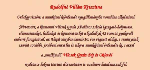 2017-ben, a 42 éves oktatói munka után nyugalomba vonuló – Rudolfné Villám Krisztina – az iskola igazgató-helyettese felé akartuk hasonló módon tolmácsolni elismerésünket és tiszteletünket. Krisztina, aki a Kuratórium oszlopos tagja is, az iskolai évzáró alkalmával vehette át díjat és az emlékező oklevelet.