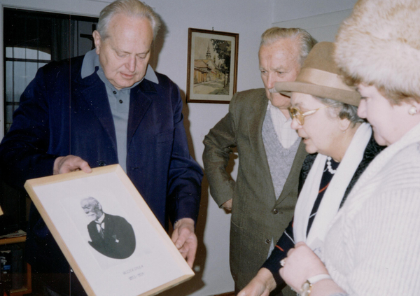 "Vilcsek Gyula a tanítványai körében" (Sándor atya, Marosi József, Joli néni, Irén,)