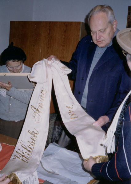 Sándor atya kezében a "Wilcsek Anna 1891" feliratú zászlószalag
