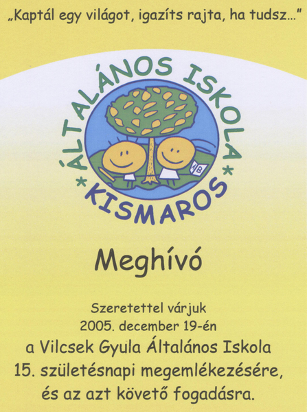 A 2005-ös év vég fordulatot hozott az eddigiekhez képest. Novemberben meghalt Joli néni, decemberben kórházba került a feleségem. Az iskola, 15. születésnapi megemlékezésére, a vállalásaim szerint már én kaptam a meghívót. Közeledvén Karácsony napjához, nem túl vidám hangulatom azt súgta, menjek Emberek közé. Kissé megkésve érkeztem az ünnepségre, de az egybegyűltek azonnal, kedvesen maguk közé fogadtak, így lettem a Vilcsek család, immár hivatalos képviselője.