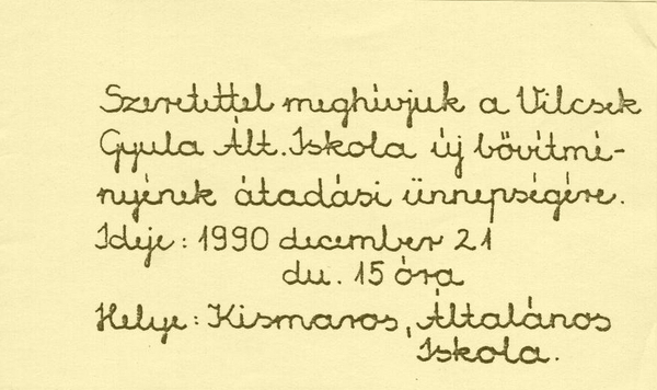 2006-ban szólt, az akkor még "csak" 88 éves édesanyám, Wilczek Márta, hogy nagyon kedvesen már többször megkereste őt a kismarosi általános iskola igazgatója, Végvári Györgyi, de ő nem tud eleget tenni a szíves invitálásnak, már nem tud részt venni az iskola rendezvényein. Csak amikor legközelebb Édesanyám meghívót kapott szülőfaluja, Kismaros általános iskolájának egyik rendezvényére, derült ki számomra, hogy a falu iskoláját még az 1990. évben anyai dédapámról, néhai Vilcsek Gyula igazgató, kántor-tanítóról nevezték el, hálából az ottani lakosság érdekében népnevelő tanítóként végzett tevékenységéért.