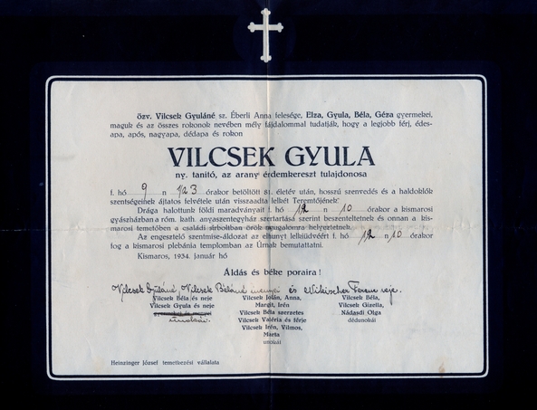 - die Pflege und Wartung der Erinnerung und der Spiritualität ihres Vorfahrens, des Lehrer-Schuldirektors, Gyula Vilcsek;