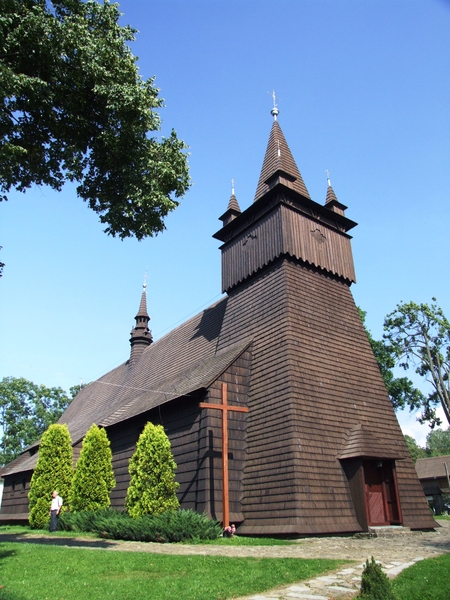 Az eddig megismert parókiák közül épületként is, meg belső kialakításában is ez a plébánia volt a legtetszetősebb. Az udvarában leparkoltunk és az épületet megkerülve jutottunk az utcafronton lévő főbejárathoz. Innen hátra-nézve éppen a fatemplom részben fák mögé búvó oldalképét láttuk. A 30-as éveinek elején járó plébános elénk jött és nagyon barátságosan üdvözölt mind-hármunkat. A nap folyamán Andrzej már igen magas szintre fejlesztette képviseletünket – szinte nem is kellett közbeszólni bemutató előadásába. A tiszteletes a téma megismerése után elvonult, majd visszatért egy kisebb halom anya-könyvvel. Boldogan vetettük rájuk magunkat, hogy azután elég gyorsan csalódjunk. Az anyakönyvek között a legrégibb sem volt öregebb 100-120 évesnél. A legrégebbi bejegyzések is a XIX. század második feléből származtak.